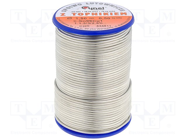Проволочный припой; Sn99,3Cu0,7; 1,5мм; 0,5кг; Упаковка: катушка