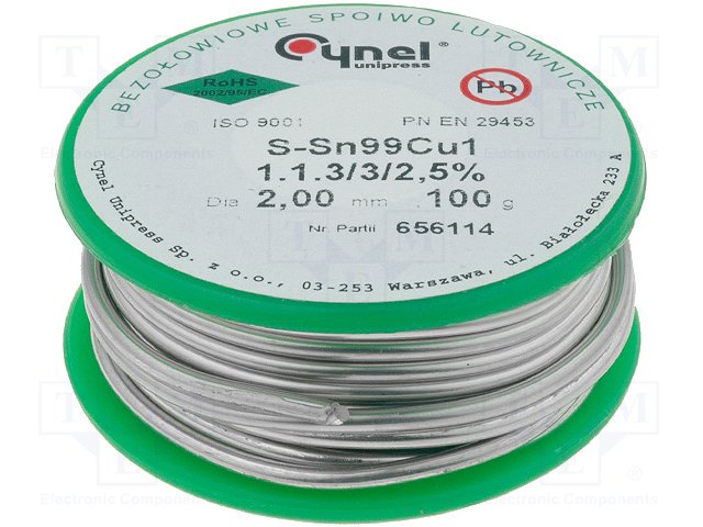 Проволочный припой; Sn99,3Cu0,7; 2мм; 0,1кг; не содержит свинца