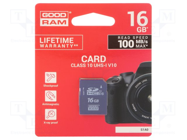 Карта памяти; SD HC; 16ГБ; Считывание: 100МБ/с; Запись: 10МБ/с