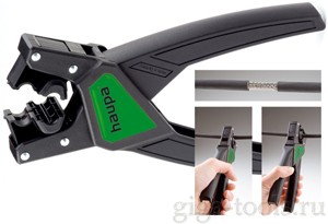 Выполнение выреза участка кабеля для систем подключения экранирования и шин выравнивания потенциалов. Совместим с кабелеукладочной системой OBO с кабельными выводами. Особенно хорошо подходит для удаления оболочки с кабелей круглого сечения в стеснённых условиях работы, напр., при работах по уравниванию потенциалов в управляющих и машинных системах, а также при работах в кабельном канале. Удаление оболочки с отрезка кабеля в любом месте. Длина выреза участка кабеля жёстко настроена. Обработка кабелей различных типов, напр., НУМ (напр., 3 х 1,5 мм2, 3 х 2,5 мм2, 5 х 1,5 мм2) или экранированных проводов