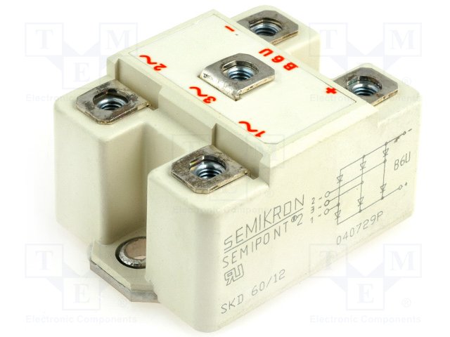 Трехфазный диодный мост; Urmax: 1,2кВ; If: 60А; Ifsm: 1кА; винтами
