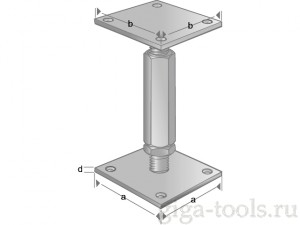 Регулируемый опорный башмак типа ВН (высокий) состоит из двух квадратных плит, к одной из которых приварен болт М16, одной низкой и одной длинной гайки. Толщина плит равна 6 мм, и в каждом ее углу просверлены 4 отверстия ?11,0 мм. В середине нижней плиты приварен болт М16. Регулируемый опорный башмак типа ВН (высокий) предназначен в качестве основы для монтажа столбов и колонн к бетонной или каменной поверхности. Находящаяся посередине опора регулируется по высоте на 40 мм, т. е. от 125 мм до 165 мм от бетонной поверхности до нижнего края столба/колонны.