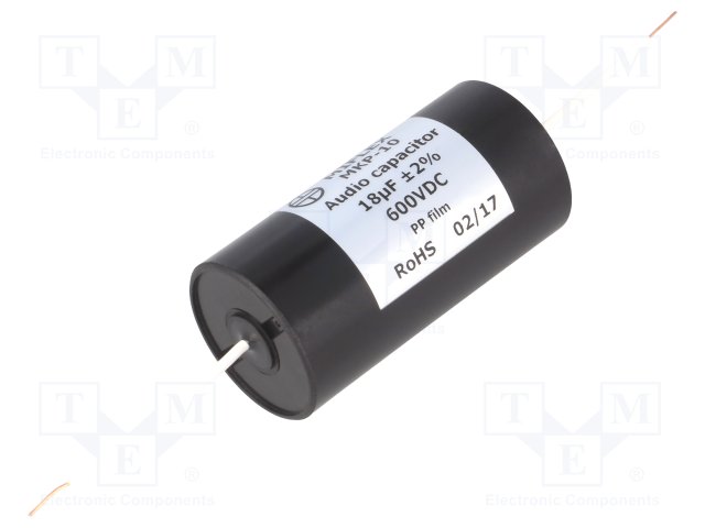 Конденсатор: полипропиленовый; 18мкФ; 600ВDC; ±2%; Ø40x78мм; 0,003