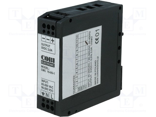 Блок питания: импульсный; 15Вт; 5ВDC; 3А; 185÷265ВAC; Монтаж: DIN