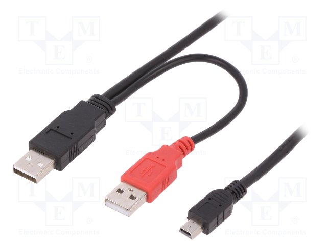 Кабель; USB 2.0; вилка USB A x2,вилка mini USB B; 1м; черный