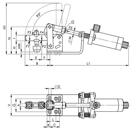 F3 или F4 = макс. достижимые зажимные усилия при 6 бар. Vn = расход воздуха для каждого двойного хода в дм³