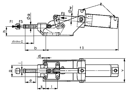 Прижимное устройство Тяжелая модель с большим сроком службы. Оснащен пневматическим цилиндром FESTO с двойным действием с дросселирующими отверстиями для снижения скорости, анодирован и смонтирован и готов к подключению, у размеров 5 и 7 запрос конечного положения невозможен. Материал: Консоль оцинкована и пассивирована, основная часть из ковкого чугуна, окрашенная. Детали рычага и шатун из улучшенной стали, оцинкованы и пассивированы. Заклепки из нержавеющей стали. Опорные участки смазаны.