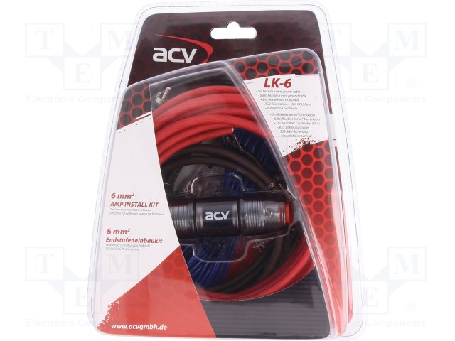 Состав набора 0,8m 6mm2 black power cable, 2 вилочных наконечника, 2 кольцевых наконечника, 30A silver fuse, 5m 6mm2 red power cable, гнездо предохранителя, кабель 2 вилки RCA / 2 вилки RCA + управление