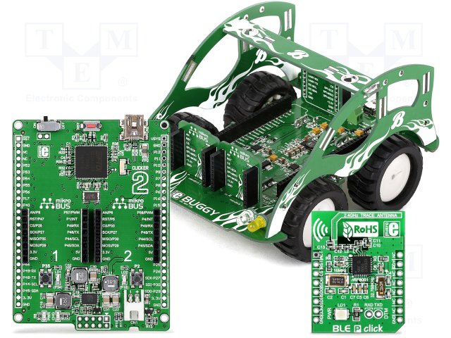 Состав набора 3 платы MikroBus, 4 колеса, MIKROE-1597, MIKROE-1724, аккумулятор Li-Po, кабель USB A - USB B mini, макетная плата