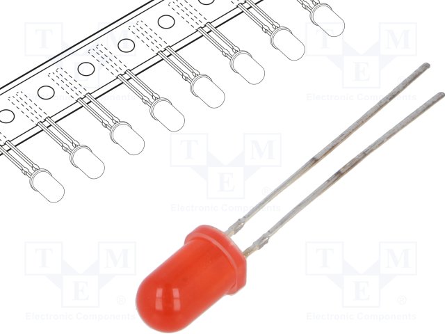 LED; 5мм; красный; 20мкд; 30°; Поверхность: выпуклая; Шаг: 2,54мм
