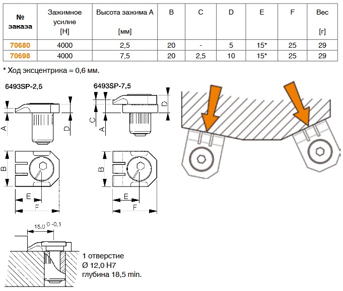 Прижимающие устройства вращаются вокруг эксцентрикового вала, передающего зажимное усилие. они могут зажимать во всех направлениях. элемент зажима (1 фиксированный упор) обеспечивает хорошее прилегание заготовки к упорам.